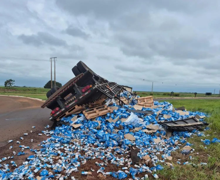Um acidente envolvendo uma carreta carregada de cerveja foi registrado por volta do meio-dia desta terça-feira (28) na BR-463, no trecho entre Dourados e Ponta Porã, em Mato Grosso do Sul. O veículo tombou no trevo de acesso a uma usina sucroalcooleira, provocando lentidão e mobilizando equipes da Polícia Rodoviária Federal e do resgate. A carreta ficou bastante danificada com o impacto e a carga se espalhou parcialmente às margens da rodovia. O motorista, identificado como Rafael, morador de Três Lagoas, sofreu ferimentos e foi encaminhado ao Hospital da Vida, em Dourados. Segundo informações preliminares, ele está fora de perigo e permanece sob observação médica.