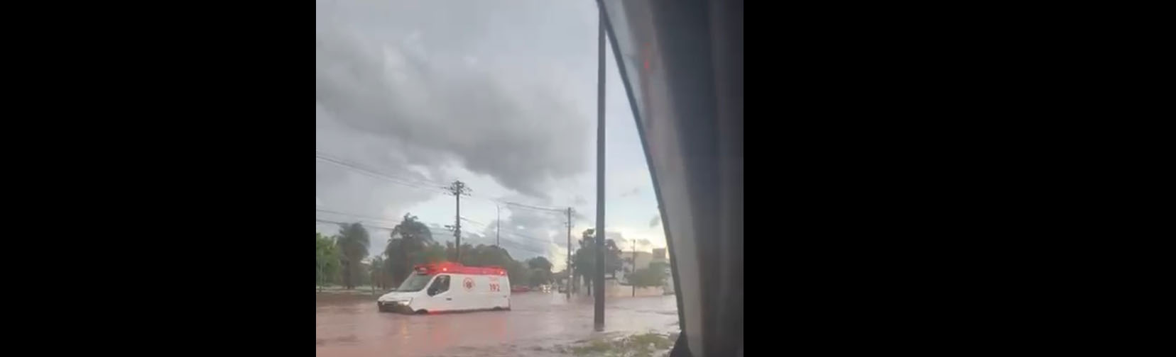 Uma ambulância do Samu que transportava um paciente vítima de AVC ficou ilhada na Avenida Costa e Silva durante forte temporal na tarde desta quinta-feira (19). O veículo perdeu tração devido ao alagamento enquanto seguia para o Hospital Regional.