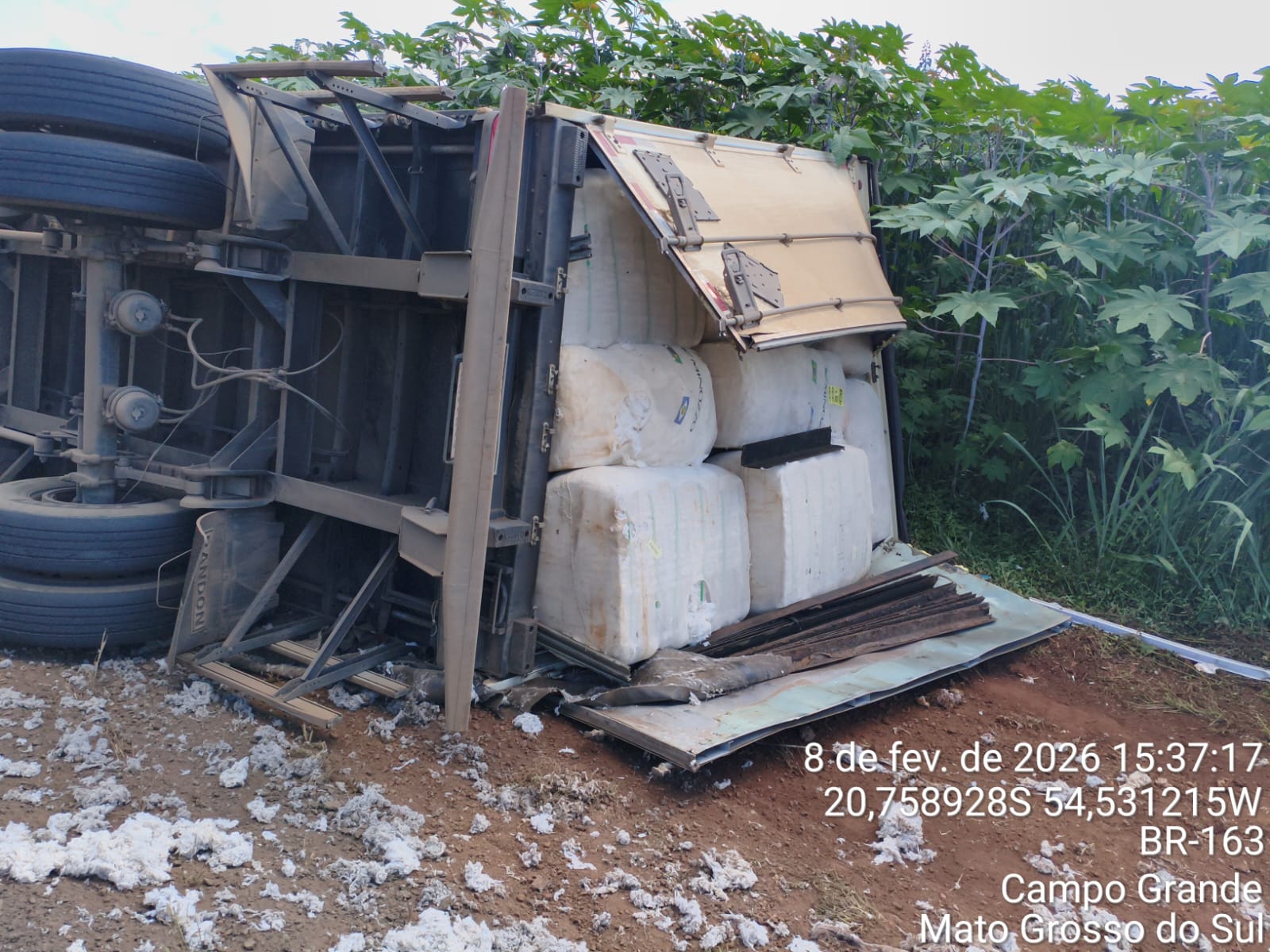 Uma carreta carregada com fardos de algodão tombou na tarde deste domingo (8) no trecho da rodovia BR-163, em Campo Grande. O motorista do veículo ficou ferido e foi encaminhado para atendimento médico.