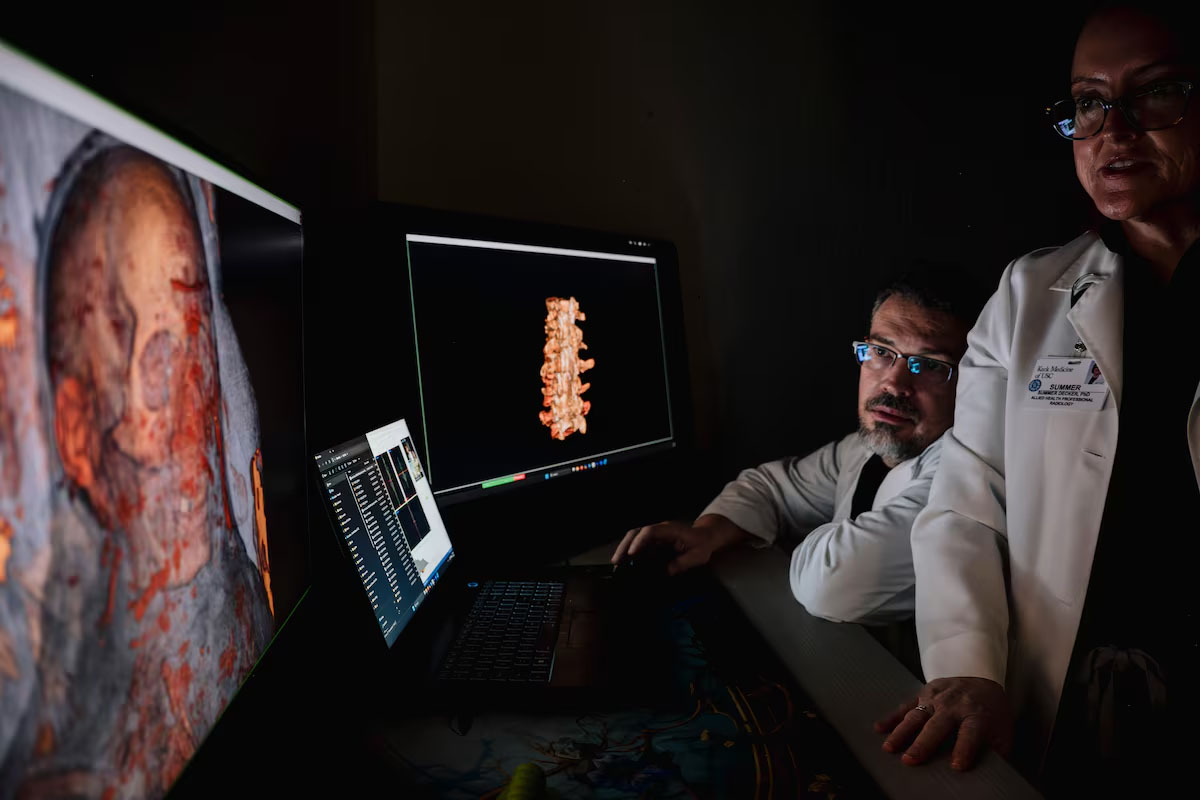 Pesquisadores da Universidade do Sul da Califórnia aplicaram tomografia computadorizada de alta resolução em múmias egípcias com mais de 2,2 mil anos, obtendo 320 cortes transversais para reconstruir modelos digitais em 3D. As análises permitiram observar fraturas antigas, possíveis cirurgias primitivas e desgaste articular, esclarecendo condições de saúde que afetaram indivíduos como Nes-Min e Nes-Hor. A equipe também utilizou impressoras 3D médicas para criar réplicas de ossos, colunas vertebrais e artefatos encontrados nos sarcófagos, sem risco de danificar os corpos. Detalhes de tecidos moles, como pálpebras, lábios e globos oculares, foram preservados digitalmente, oferecendo uma visão humana das múmias.