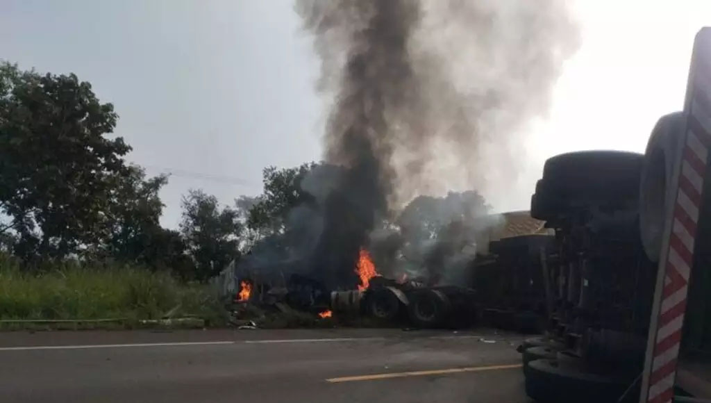Acidente entre caminhões provoca incêndio e bloqueia rodovia