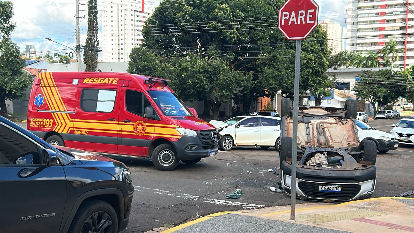 Um forte impacto entre dois veículos de passeio resultou no capotamento de um deles na manhã desta quarta-feira (8), no cruzamento da Rua Brasil com a Rua Abrão Júlio Rahe, no Jardim dos Estados em Campo Grande. Imagens registradas por populares mostram o carro tombado no meio da via e pessoas ajudando passageiros presos e visivelmente abalados. Testemunhas relatam que a cena ocorreu poucos segundos após a batida, que deixou a frente de um dos veículos completamente destruída, sugerindo alta velocidade.