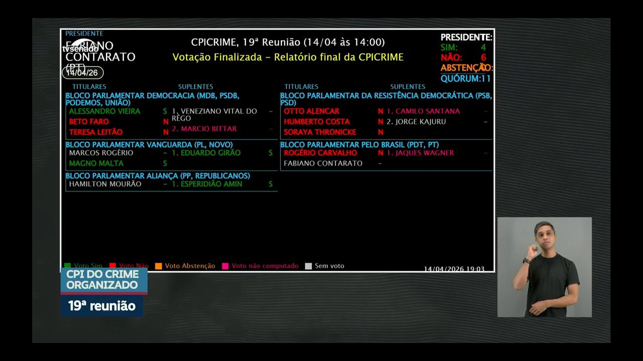 Por 6 votos a 4, foi rejeitado o relatório final da CPI do Crime Organizado. O parecer do senador Alessandro Vieira (MDB-SE) pedia o indiciamento de três ministros do Supremo Tribunal Federal (STF) e do procurador-geral da República, Paulo Gonet. O texto também propunha medidas para o combate a crimes financeiros e à atuação de organizações criminosas.