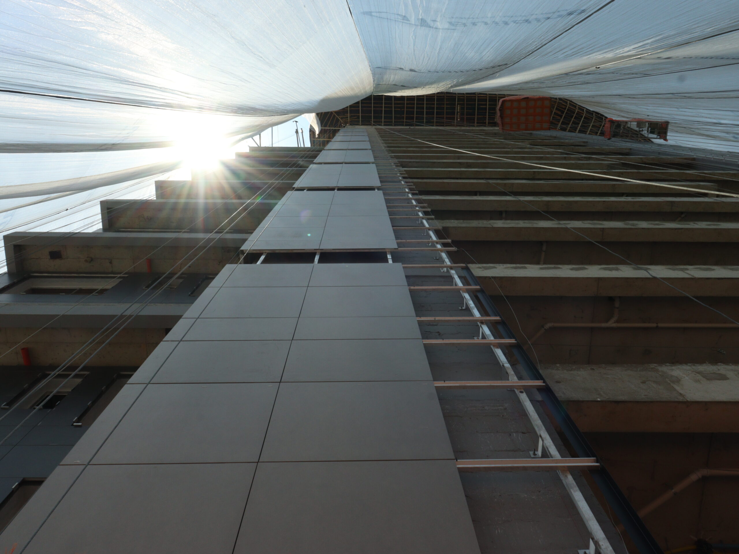 O edifício de 50 andares contará com fachadas ventiladas em porcelanato, instaladas de forma destacada da estrutura principal. Diferentemente dos revestimentos tradicionais aderidos, esse sistema cria uma câmara de ar contínua entre a parede e o revestimento externo, permitindo que o edifício “respire”.