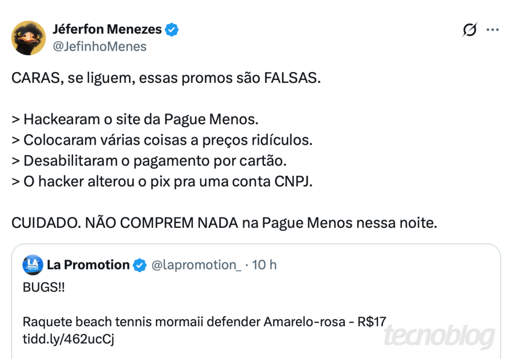 A Pague Menos declarou ao Tecnoblog que identificou uma “instabilidade pontual” no ambiente digital, sem confirmar que se trata de atividade maliciosa. Ela disse que o problema levou a inconsistências na configuração dos pagamentos via Pix