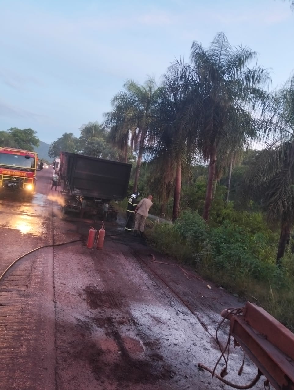 Na madrugada desta terça-feira (27), o Corpo de Bombeiros Militar foi acionado para combater um incêndio em uma carreta bitrem na rodovia BR-262, próximo à região de Maria Coelho, na zona rural do município. O veículo, que transportava uma carga de minério, teve um de seus articulados atingido pelas chamas, e o fogo se alastrou para a vegetação às margens da rodovia, exigindo ação rápida da equipe de combate.