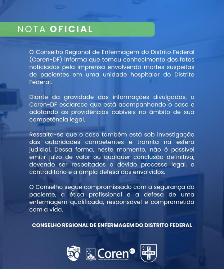 O Hospital Anchieta demitiu os três após identificação de “circunstâncias atípicas” nas mortes, e o Coren-DF acompanha o caso. As vítimas têm 75, 63 e 33 anos, sendo uma aposentada, um servidor público e um homem. A investigação segue em andamento, com a Polícia Civil analisando materiais apreendidos e testemunhos.