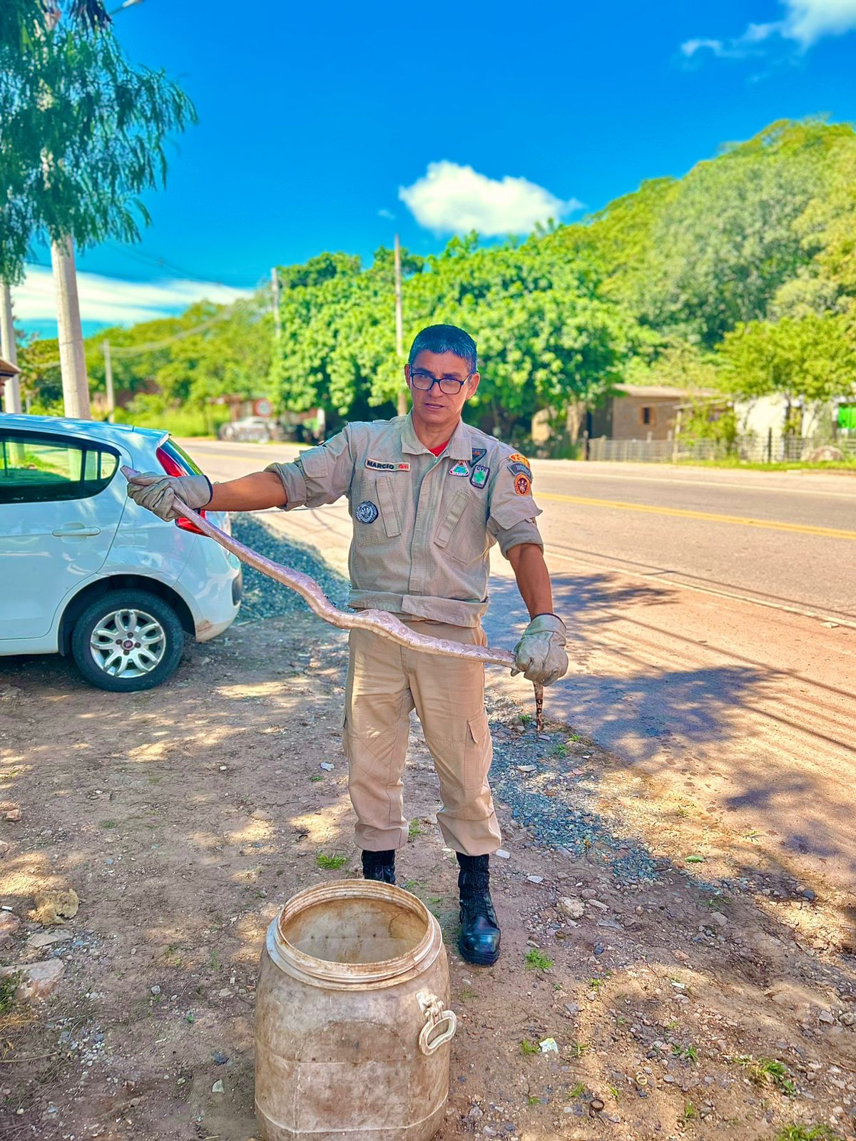 Na manhã de terça-feira (17), uma jiboia de aproximadamente 1,5 metro foi capturada pelo Corpo de Bombeiros em frente a uma garagem na Rua 21 de Setembro, no anel viário de Corumbá (MS). O animal estava ao lado de um carro, impedindo o morador de acessar o veículo e gerando preocupação com possíveis acidentes.