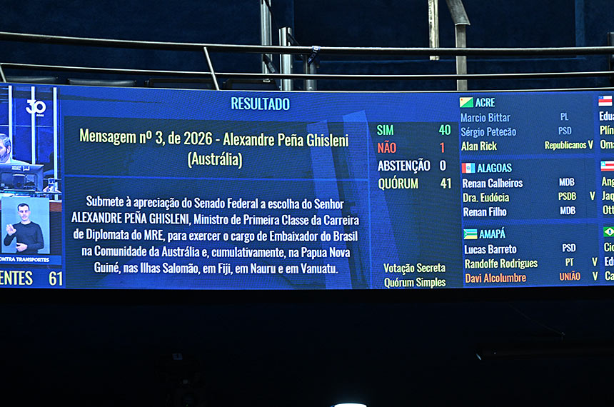 O Plenário aprovou nesta terça-feira (14) a indicação de quatro embaixadores para comandar representações brasileiras no exterior. Os diplomatas vão servir nas embaixadas de Austrália, Finlândia, Nova Zelândia e Tailândia. Outras nove mensagens que estavam na pauta devem ser votadas nesta quarta-feira (15).