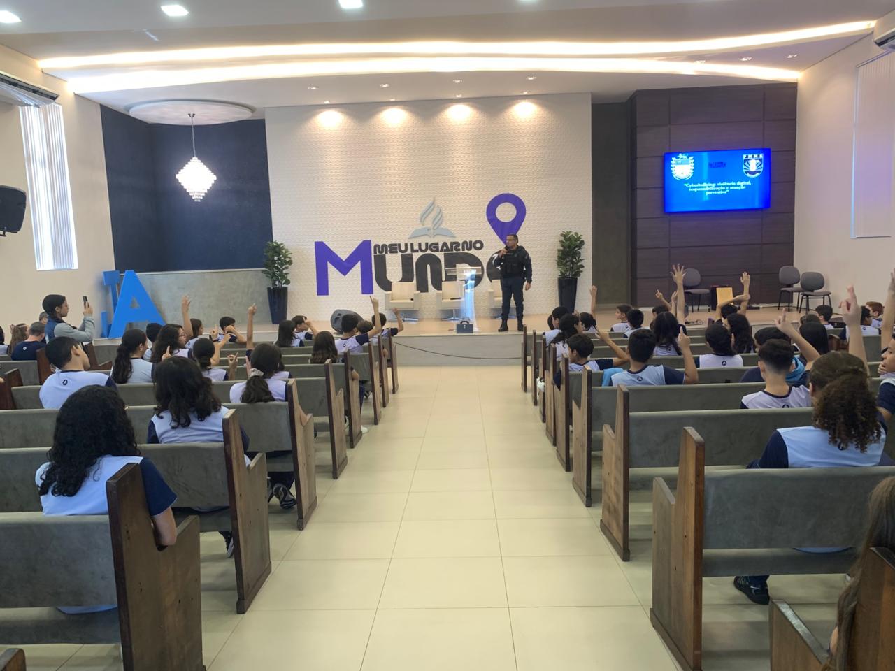 A Polícia Militar de Mato Grosso do Sul realizou, na última sexta-feira (27), uma palestra educativa na Escola Adventista, em Nova Andradina, voltada a alunos do 5º ao 9º ano do ensino fundamental. A ação foi conduzida pelo 1º Tenente Aldo, acompanhado da Cabo Lucilene, por meio do 8º Batalhão de Polícia Militar, dentro das atividades do PROMUSE/Ronda Escolar. Durante o encontro, foram abordados temas como bullying e cyberbullying, com foco na conscientização, prevenção e nas consequências dessas práticas no ambiente escolar e digital.