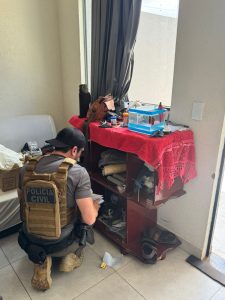 Durante o cumprimento do mandado de busca e apreensão, foram apreendidos 2 aparelhos celulares, 1 pen drive e 1 cartão de memória, materiais que poderão contribuir para o aprofundamento das investigações e para a coleta de elementos probatórios relacionados aos fatos apurados.