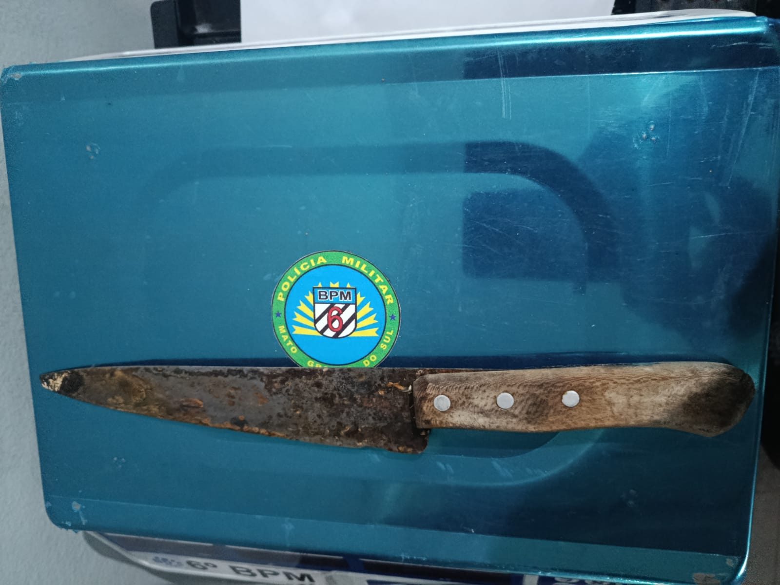 Diante da situação, a equipe policial realizou a condução do autor e da vítima à Delegacia de Polícia Civil para as providências legais cabíveis. A faca utilizada na agressão foi localizada no interior da residência e apresentada à autoridade policial.