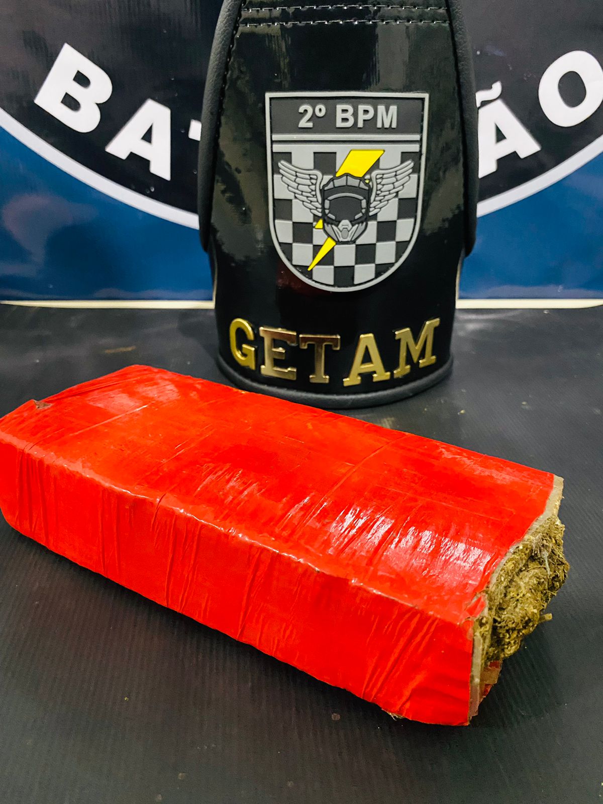 Nesta quarta-feira, por volta das 17h30, uma guarnição do GETAM do 2º BPM durante policiamento ostensivo nas proximidades da estação rodoviária os policiais visualizaram uma sacola escondida em meio a vegetação, embaixo de uma árvore, onde ao ser verificado seu interior localizaram um tablete de maconha, pesando 650 gramas.