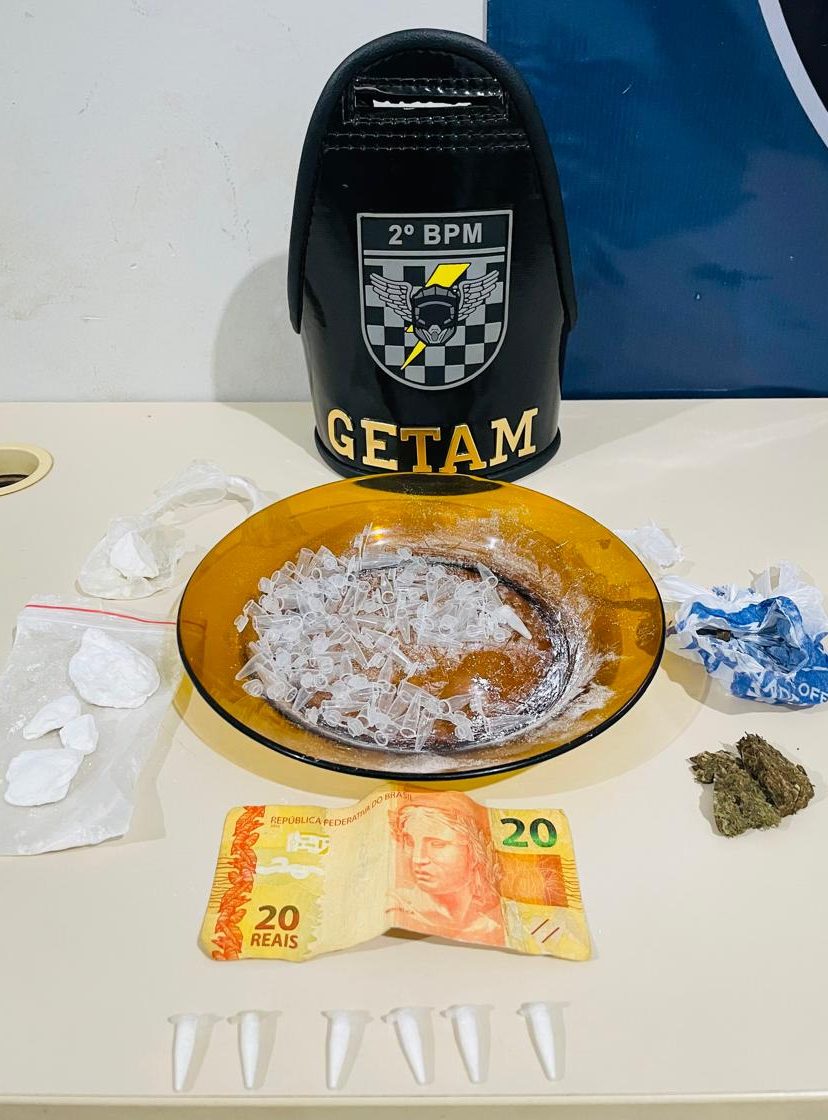 Nesta sexta-feira, durante a Operação Força Total, uma equipe do GETAM do 2º BPM durante rondas no bairro Jardim das Violetas realizou a abordagem policial de um casal onde durante busca pessoal do masculino de 36 anos, vieram a localizar 6 “pinos” de cocaína o qual em entrevista veio a relatar ser usuário, informando ter adquirido o entorpecente da mulher.