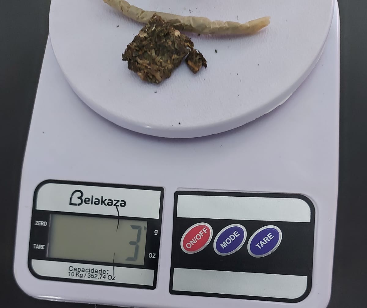 Diante da atitude suspeita, foi realizada a abordagem. Durante a busca pessoal, os militares localizaram duas carteiras de cigarro, sendo que em uma delas havia um cigarro e um pequeno pedaço de substância análoga à maconha, totalizando aproximadamente 3 gramas.