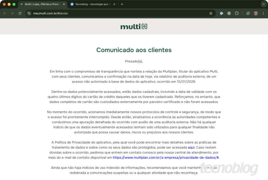 Aviso foi publicado no site da Multiplan (imagem: Thássius Veloso/Tecnoblog)
